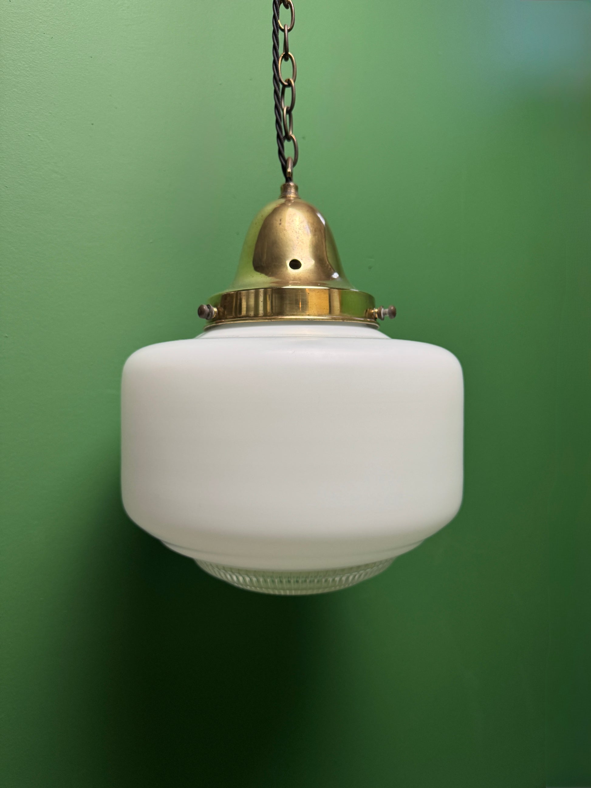1930s British made diffused Opaline pendant lights.