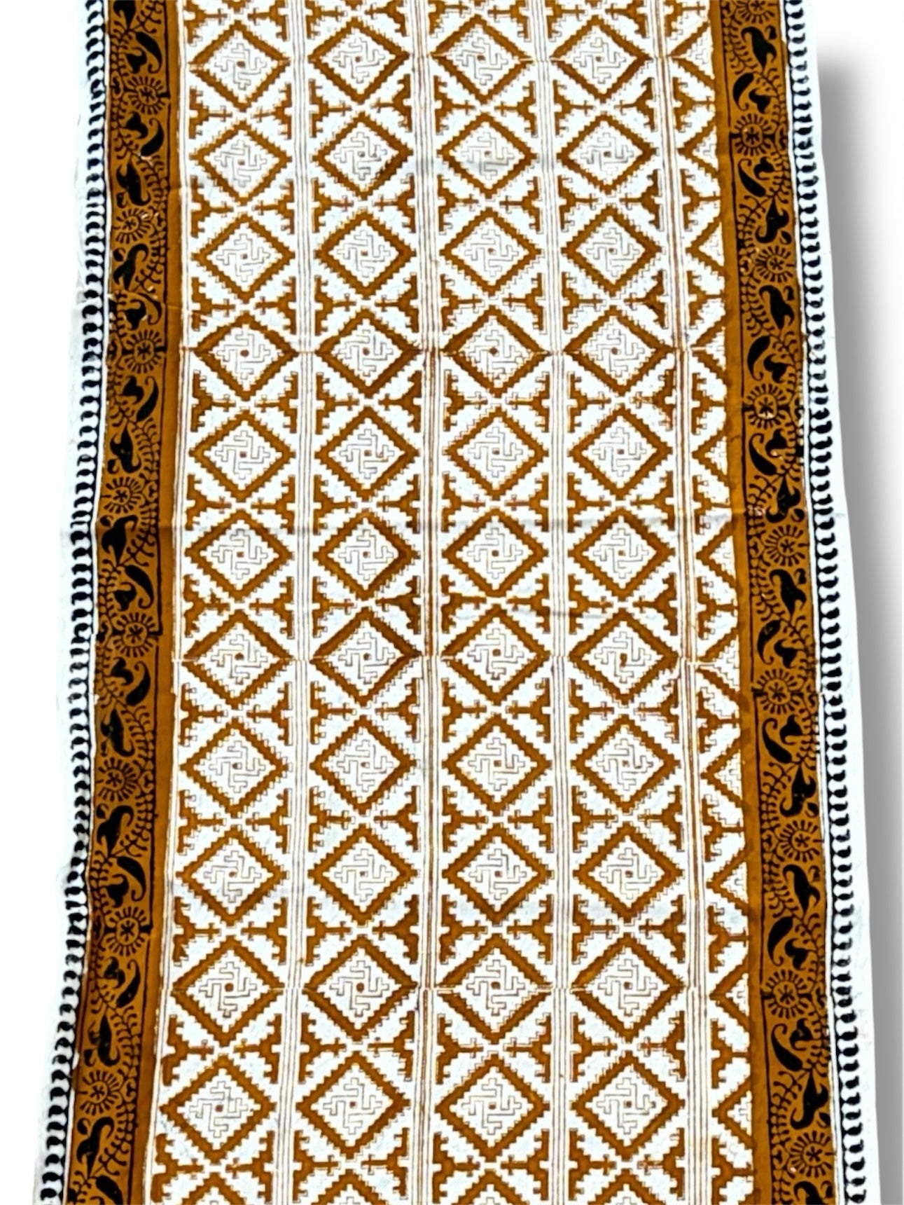 A beautiful hand block printed Ghalamkari runner from Isfahan in Iran. Natural dyes block printed onto a good medium to heavy weight organic cotton. These decorative cloths are used traditionally as bed covers, table cloths, throws & wall art.