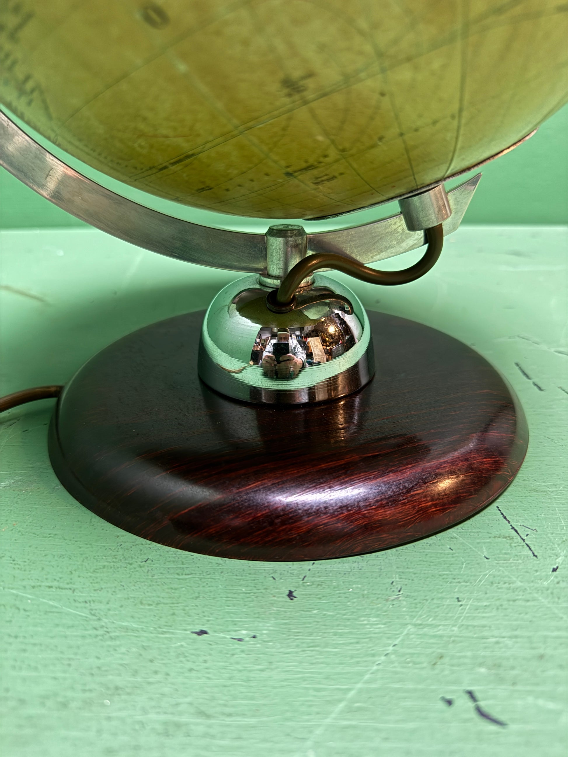 A very nice example from renowned German globe makers JRO Globus Munchen. Glass globe lamp standing on an amazing chrome & Bakelite plinth.